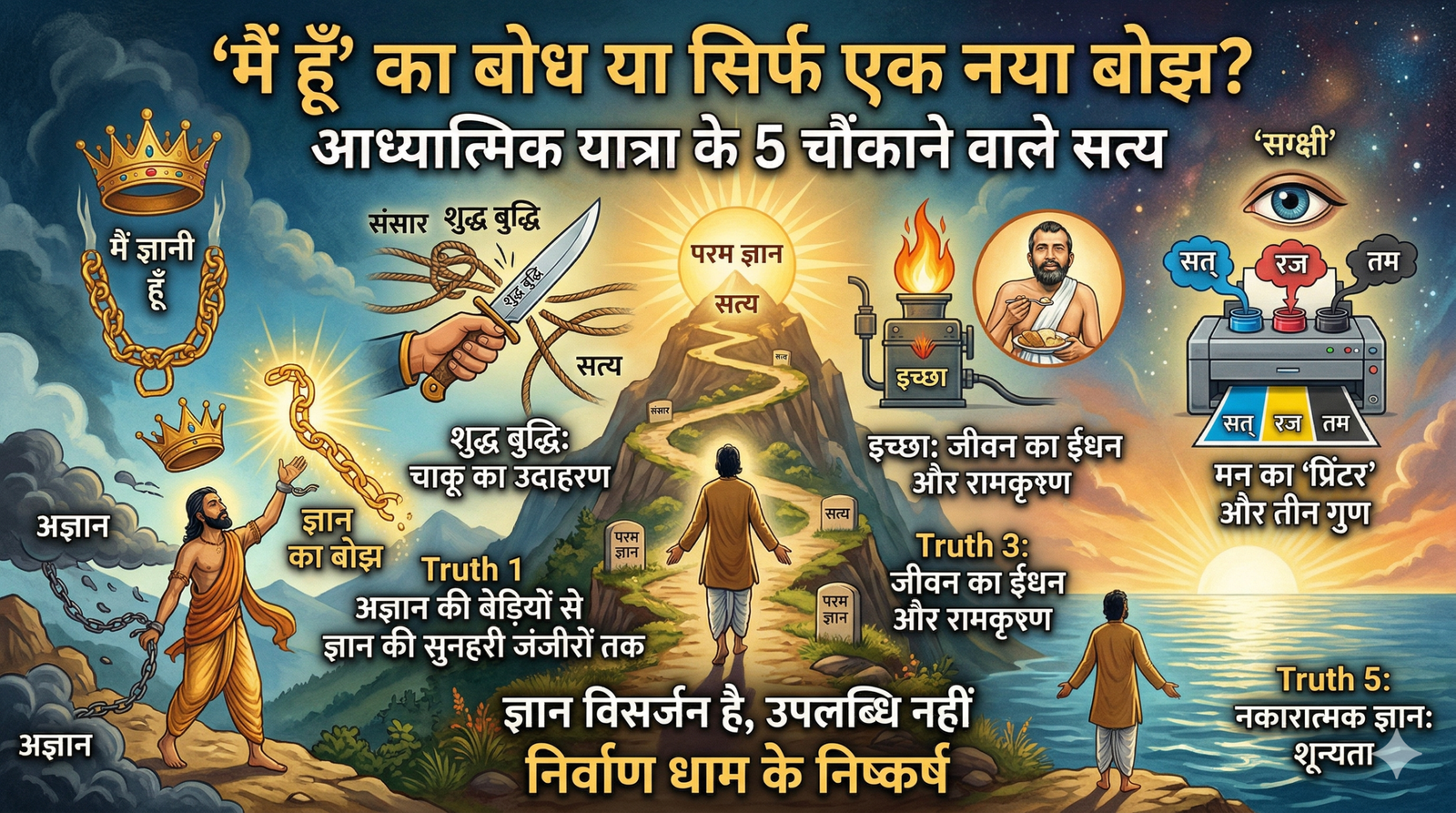 अक्सर आध्यात्मिक पथ पर चलते हुए हम एक विचित्र विरोधाभास का शिकार हो जाते हैं। हम अज्ञान के अंधेरे से तो बाहर निकल आते हैं, लेकिन अनजाने में ही “मैं मुक्त हूँ” या “मैं ज्ञानी हूँ” के एक नए और सूक्ष्म बोझ के नीचे दब जाते हैं। यह स्थिति वैसी ही है जैसे कोई व्यक्ति लोहे की बेड़ियाँ काटकर सोने की जंजीरें पहन ले और उन्हें आभूषण समझने की भूल कर बैठे। ‘निर्वाण धाम’ की गहन आध्यात्मिक चर्चाओं से जो निष्कर्ष निकलकर सामने आए हैं, वे हमारे तथाकथित ‘बोध’ की परतों को उधेड़कर रख देते हैं। आइए, सत्य की उस गहराई में उतरें जहाँ ज्ञान कोई उपलब्धि नहीं, बल्कि एक विसर्जन है।